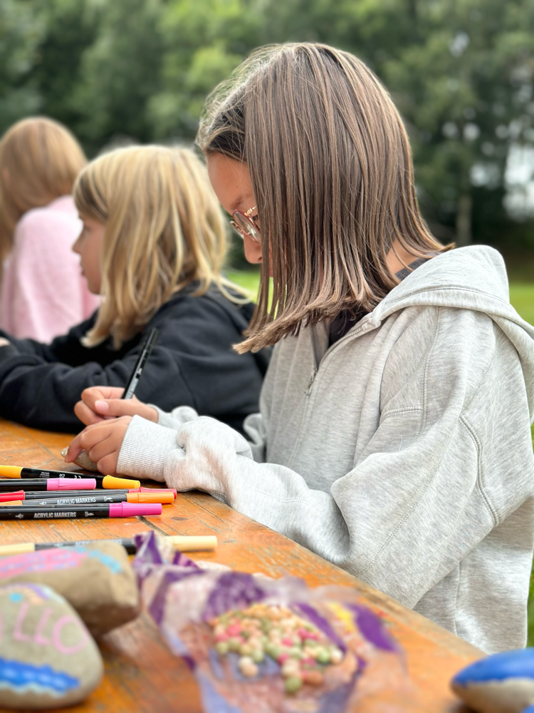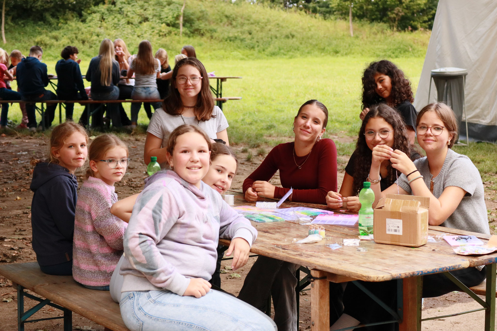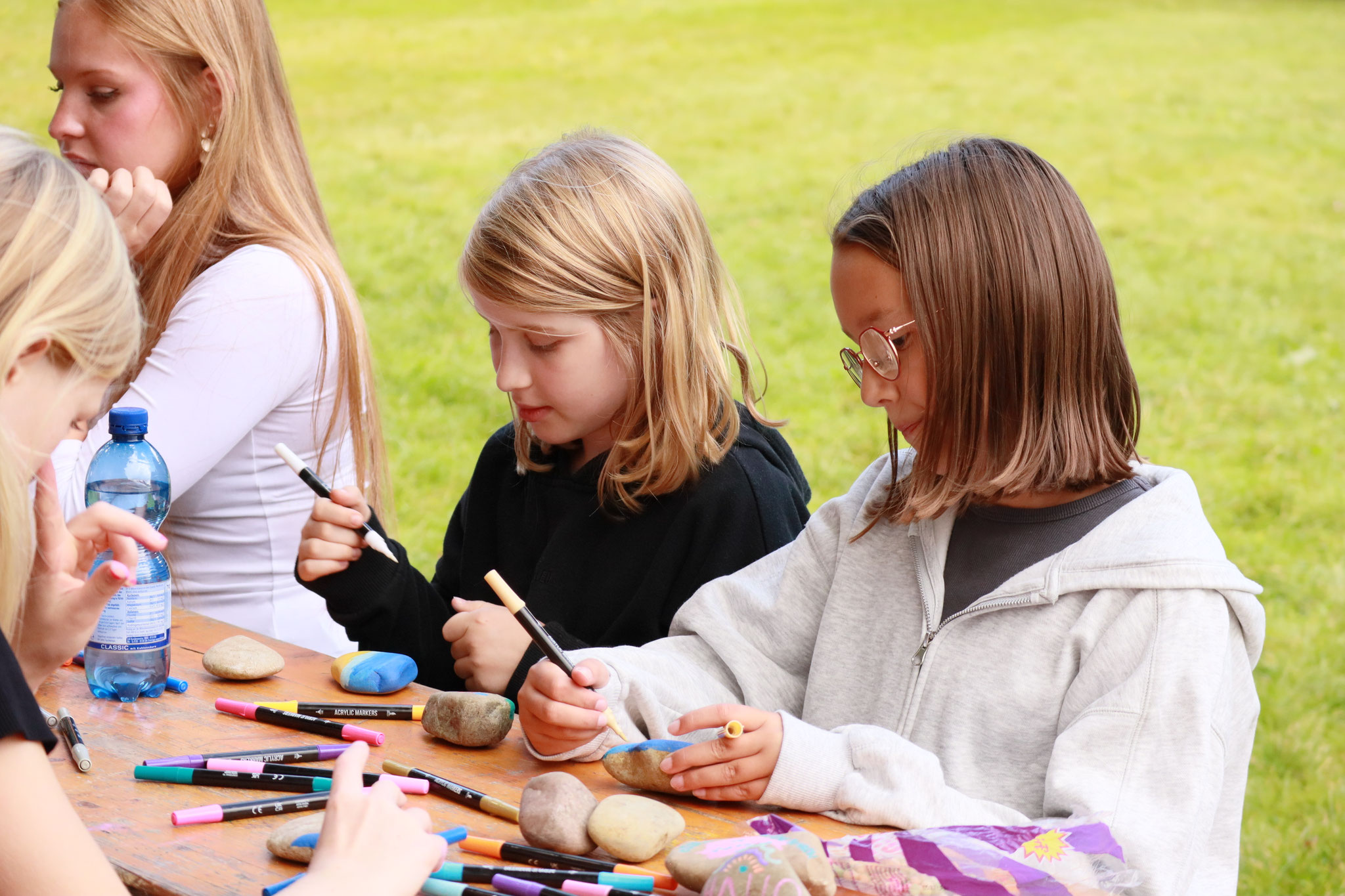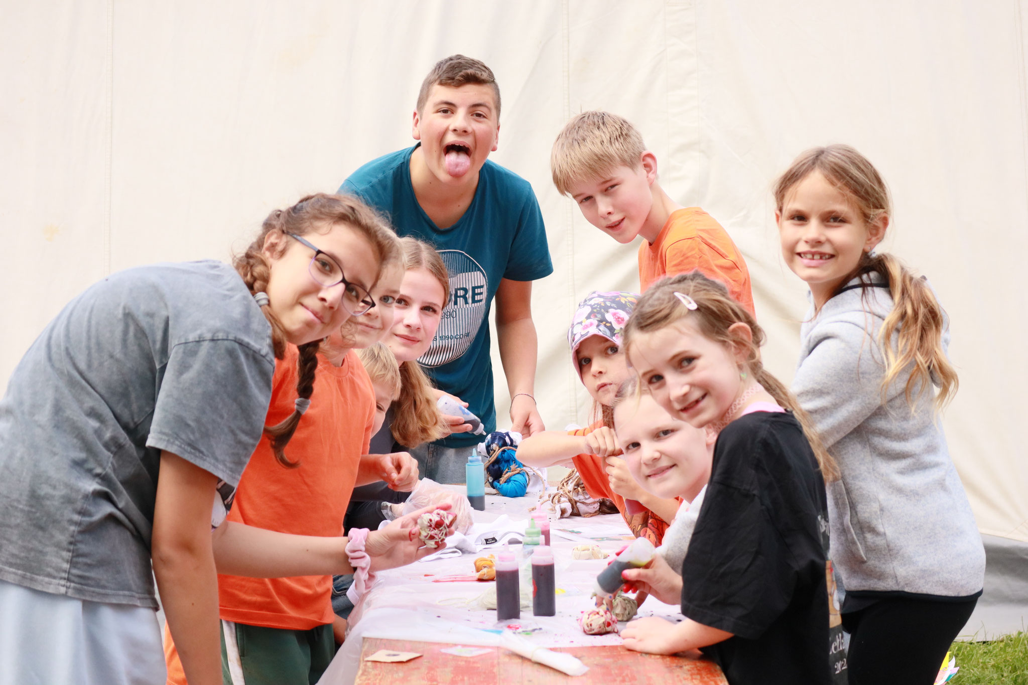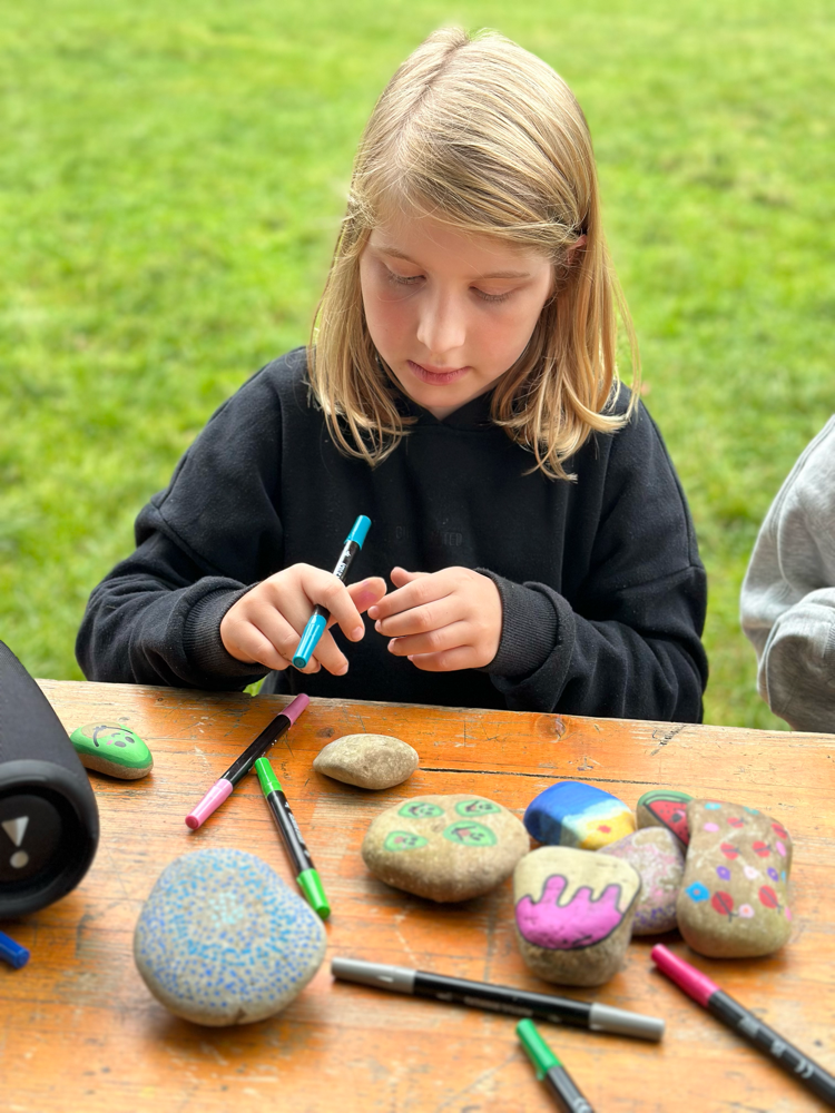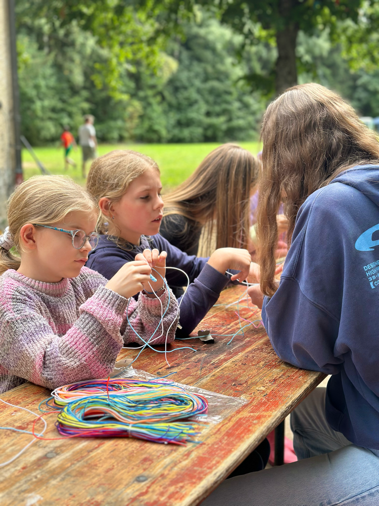 Dann hieß es: Projektgruppen! Zum ersten von zwei Terminen konnten die Kinder aus zehn Angeboten frei wählen: Brote backen, Wellness, Sport, Armbänder knüpfen, Scooby-Doo-Bänder, Batiken, Gesellschaftsspiele, Leinwände gestalten, Papiertrikots bemalen und Steine verschönern. Der Platz war erfüllt von Kreativität, Bewegung und jeder Menge Lachen.
