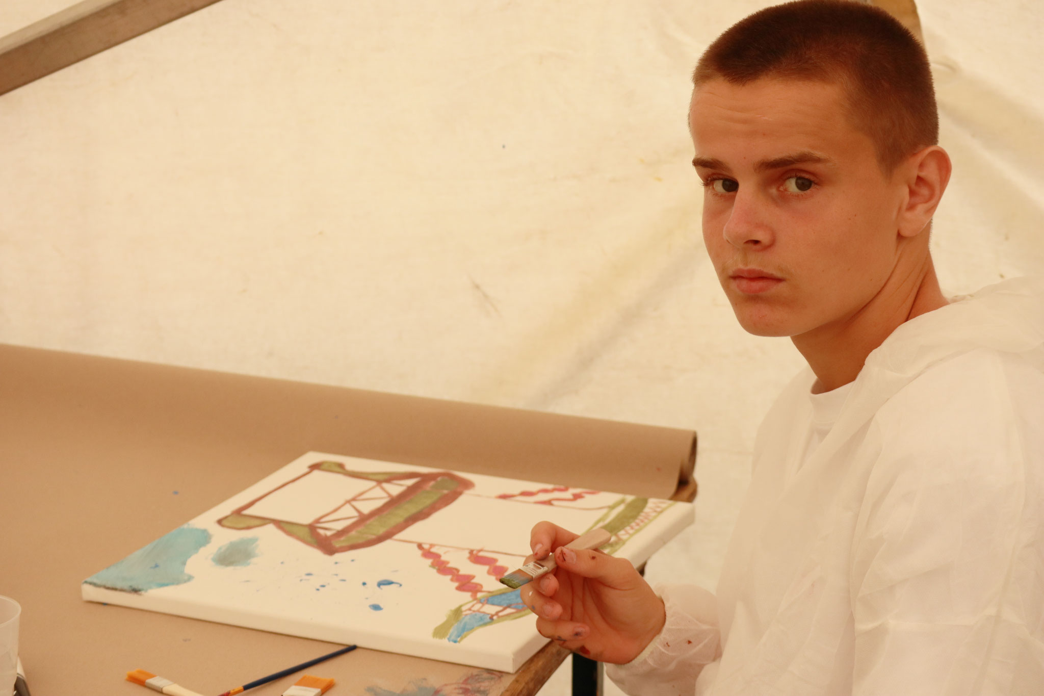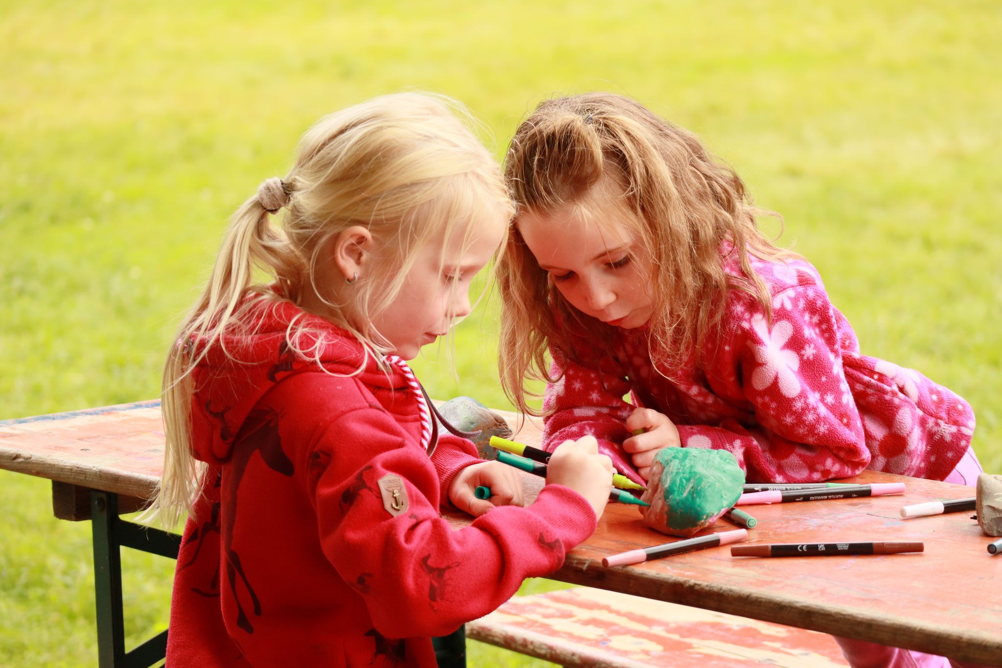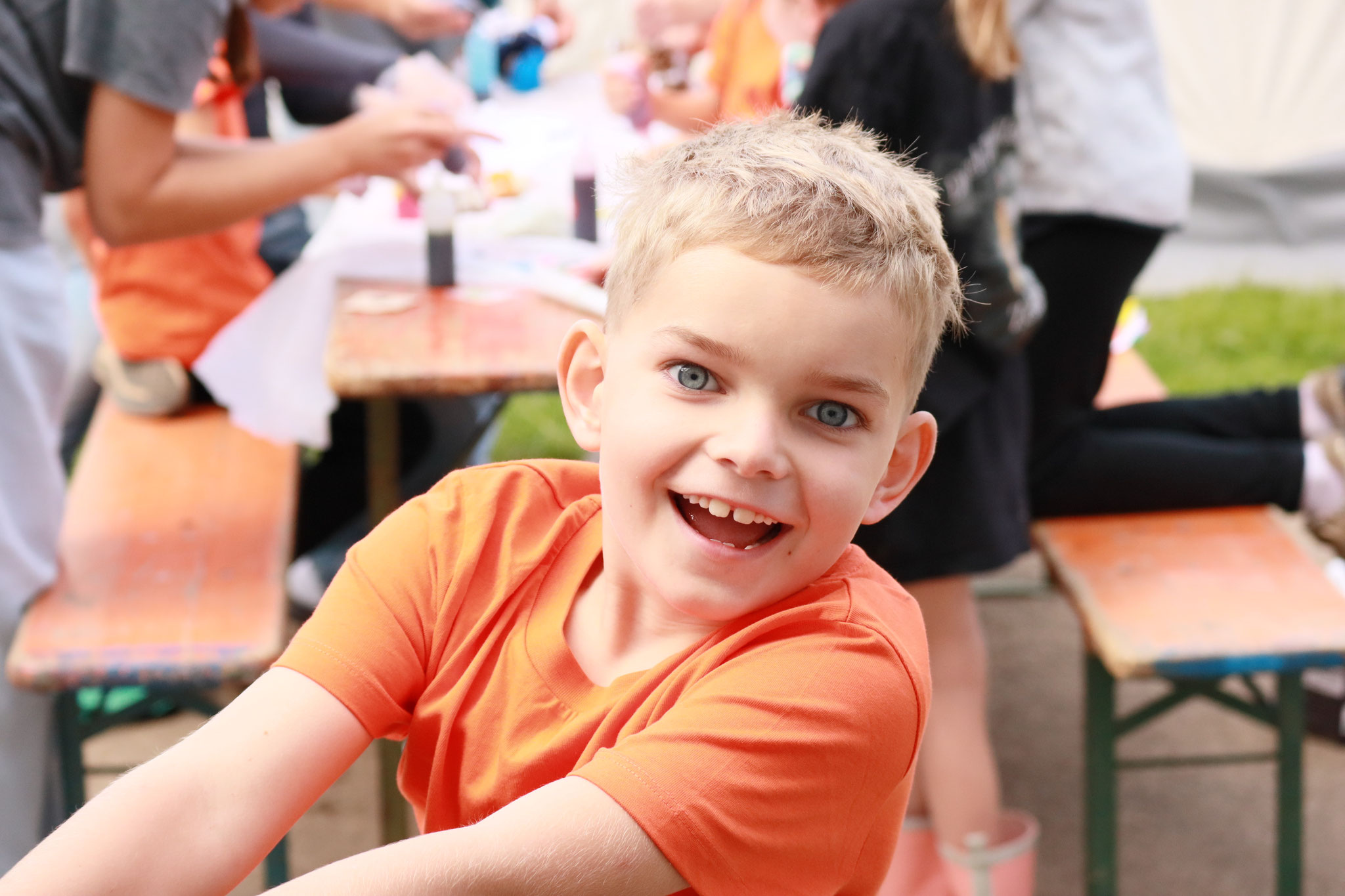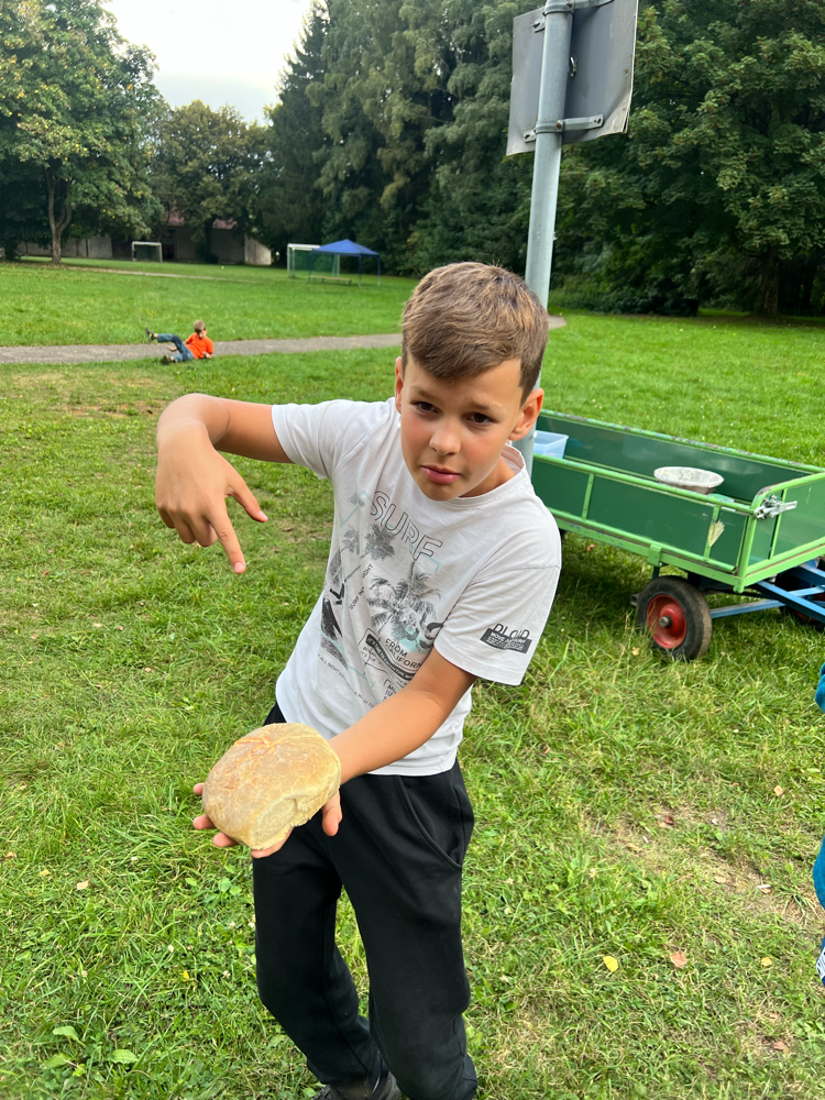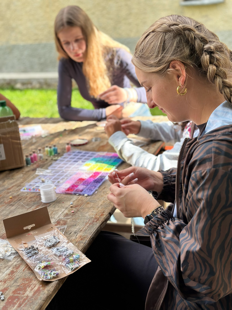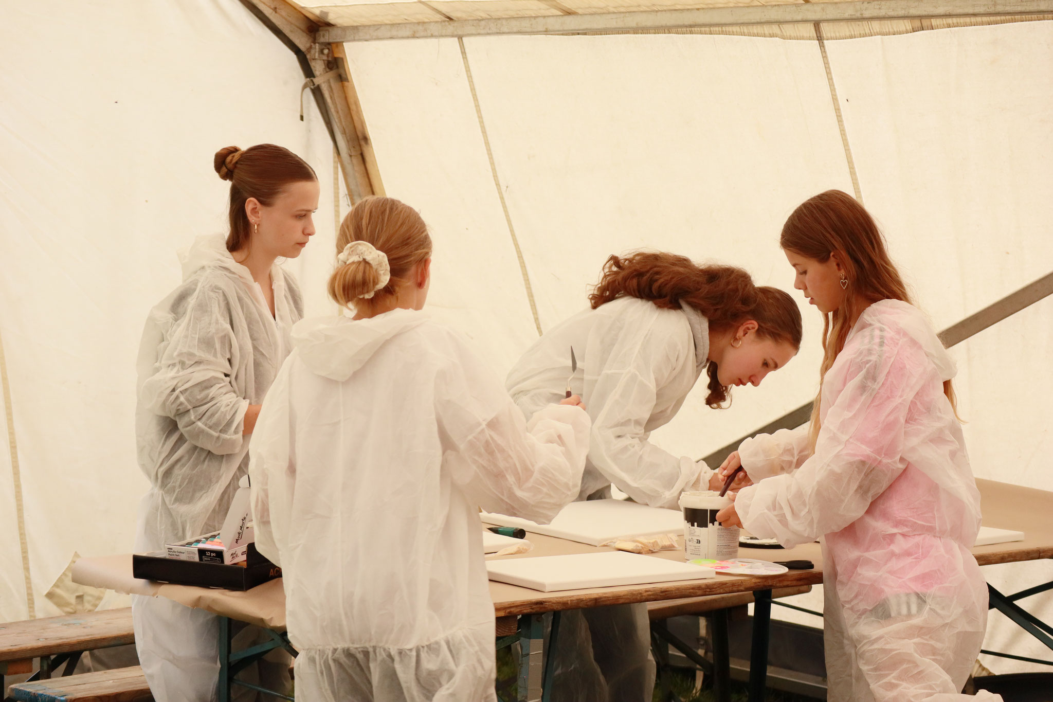 Dann hieß es: Projektgruppen! Zum ersten von zwei Terminen konnten die Kinder aus zehn Angeboten frei wählen: Brote backen, Wellness, Sport, Armbänder knüpfen, Scooby-Doo-Bänder, Batiken, Gesellschaftsspiele, Leinwände gestalten, Papiertrikots bemalen und Steine verschönern. Der Platz war erfüllt von Kreativität, Bewegung und jeder Menge Lachen.