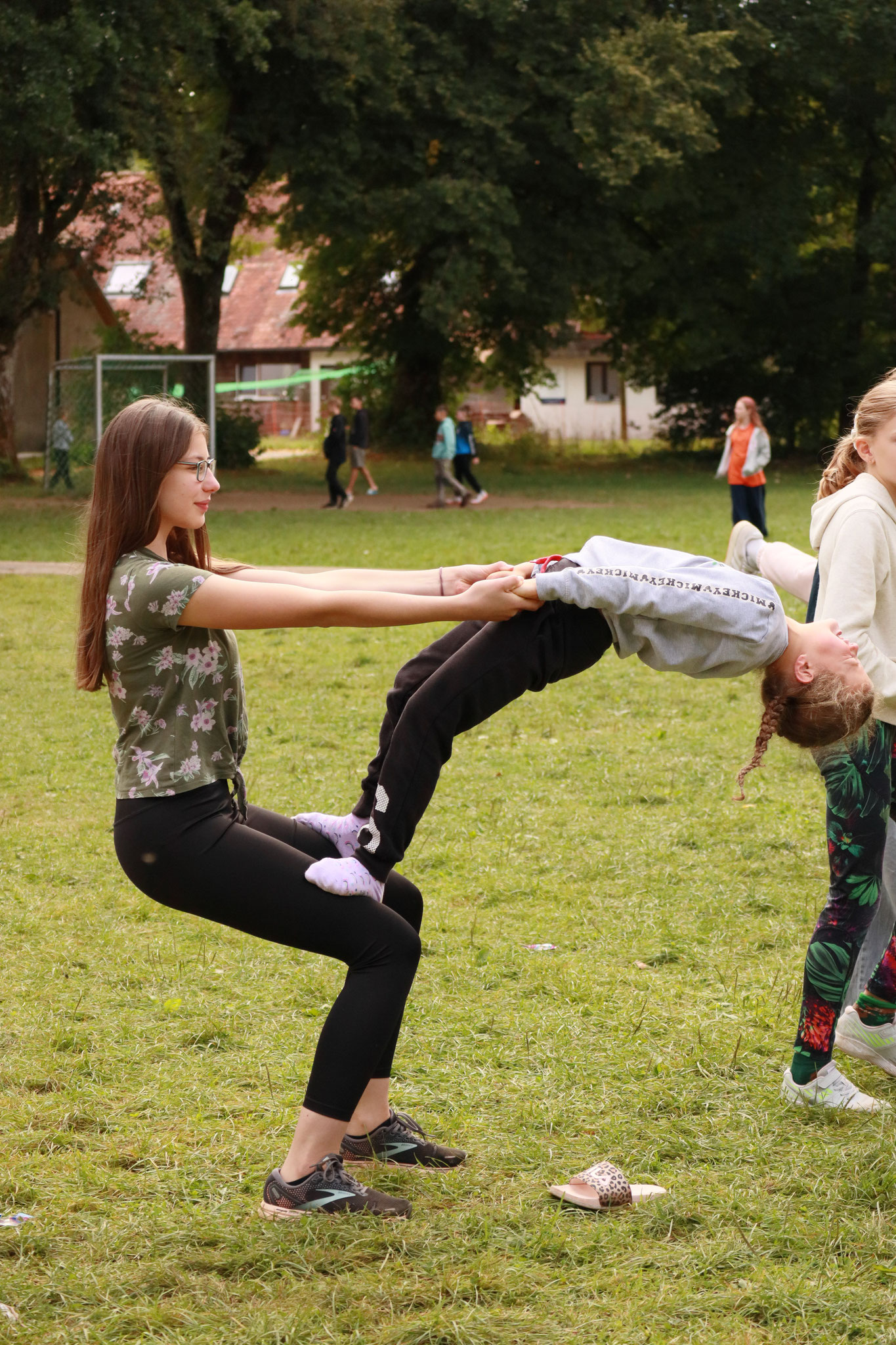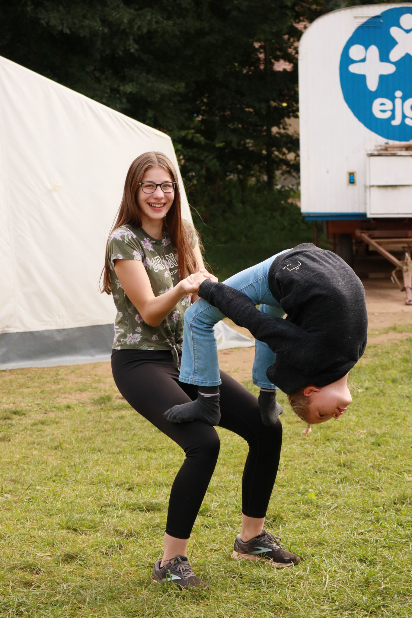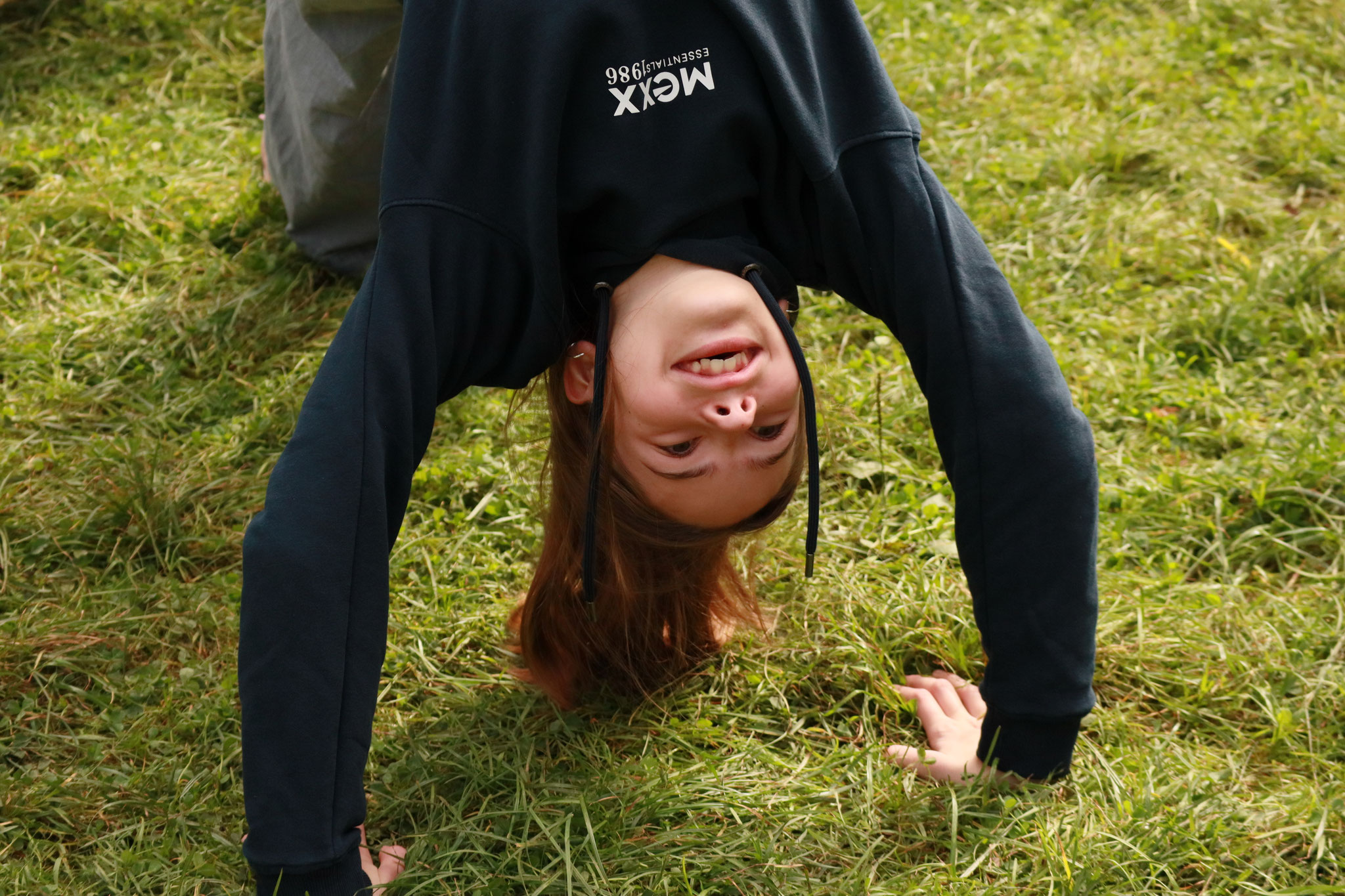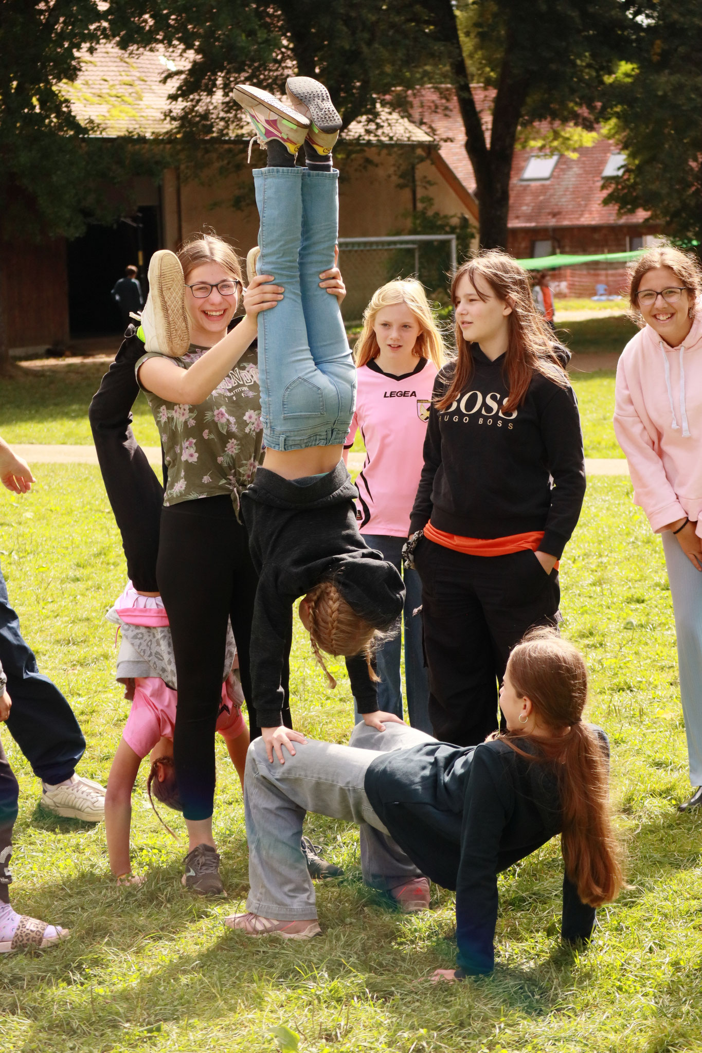 Nach dem großen Spiel verwandelte sich der Zeltplatz plötzlich in eine Turnhalle. Viele Kinder entpuppten sich als wahre Akrobaten: Es wurden Choreografien ausprobiert, Räder geschlagen, Brücken gebaut und allerlei Kunststücke gezeigt. Die Begeisterung war riesig – und die lachenden Gesichter auf den Bildern sprechen wohl am besten für sich.